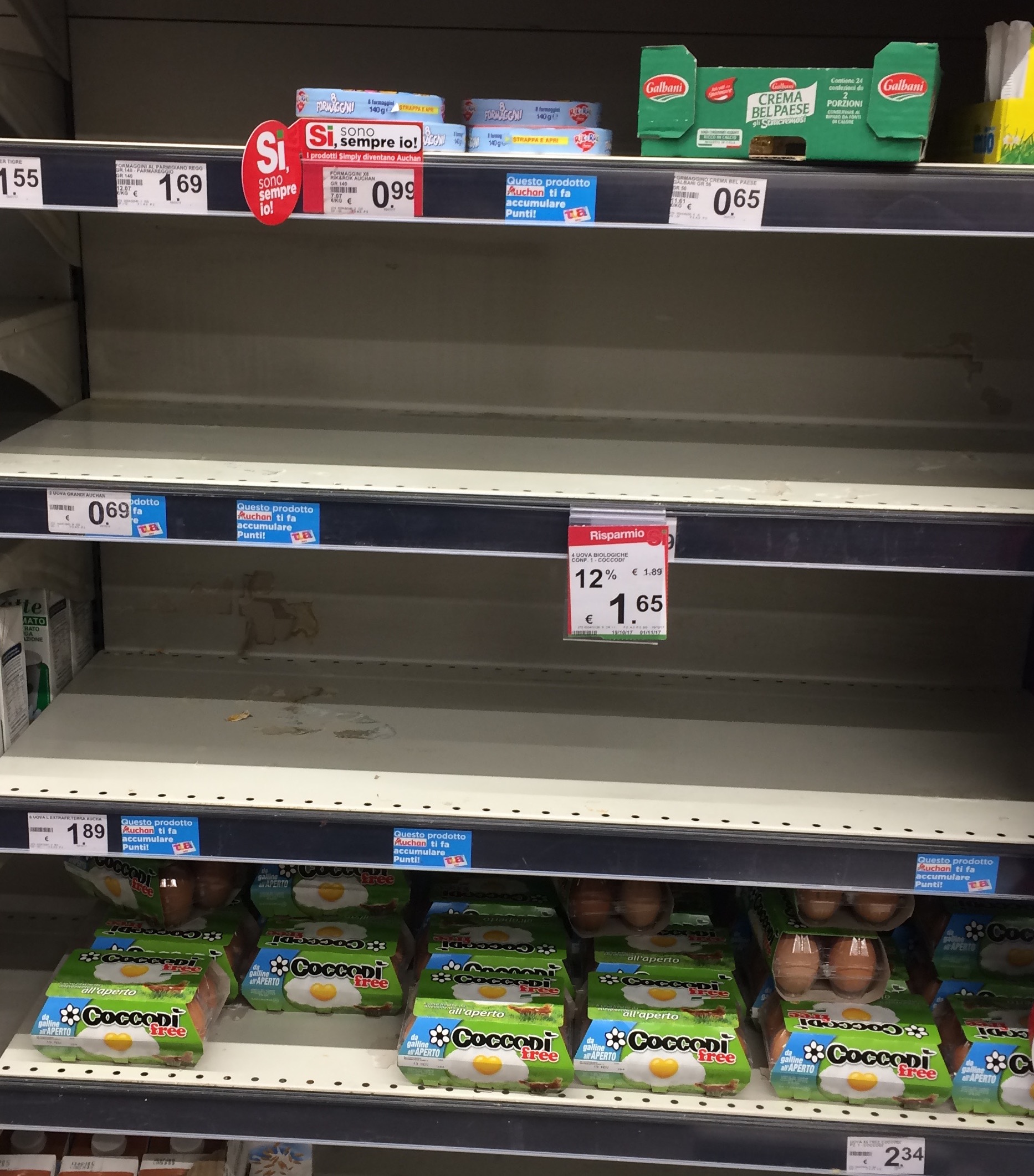 Un così elevato numero di galline a riposo forzato (circa 4 milioni solo nel nostro Paese) sta provocando una carenza di uova nei supermercati. Basta fare un giro in alcuni punti vendita per rendersene conto (leggi articolo). Venerdì 27 ottobre a Milano nell’Esselunga di via Feltre l’assortimento è dimezzato. Alla Coop di via Palmanova gli scaffali sono pieni, ma lo staff conferma i problemi di approvvigionamento. Da Pam in Via Padova oltre la metà degli spazi sono vuoti e, secondo l’addetto al rifornimento a fine giornata non ci saranno più uova. Da Simply in via Andrea Doria la situazione è peggiore. Alle 9:30 del mattino ci sono solo due dozzine di uova e un signore alla cassa si lamenta perché la situazione va avanti da alcune settimane. Stessi problemi da Lidl dove alle sei di sera troviamo solo un cartone con una decina di confezioni.