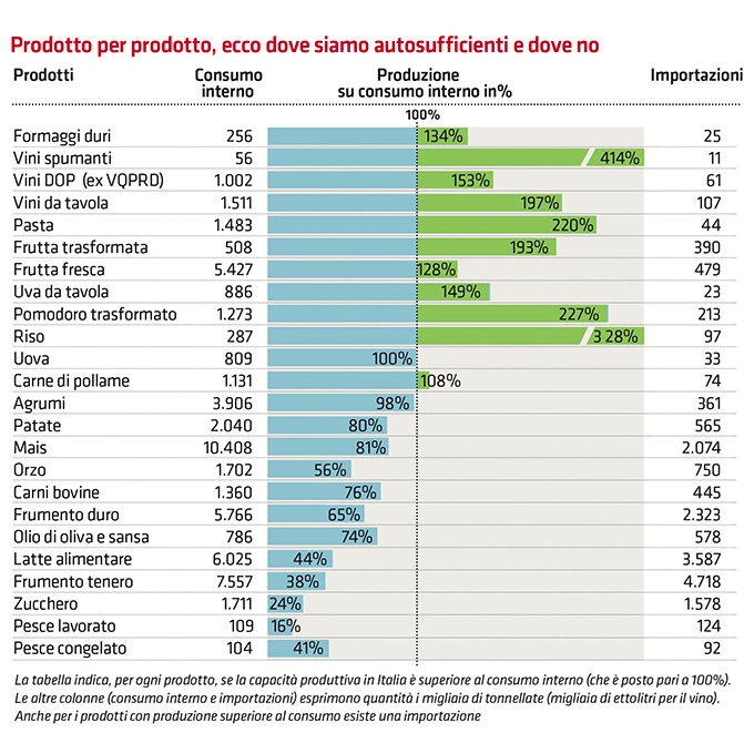 Segnalo soprattutto due frasi: “Alla luce di questi dati la ricerca insistente dell’alimento fatto solo con materie prime italiane ha poco senso, tranne per alcune categorie merceologiche dove siamo autosufficienti.” e