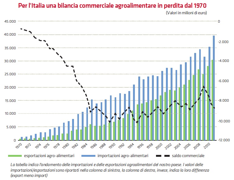 A volte si dimentica che le importazioni sono “forzate” se vogliamo essere pagati per l’esportazione di prodotti industriali. Nel commercio mondiale c’è ancora il baratto! L’Italia esporta macchinari e tecnologia e in cambio riceve prodotti agricoli, gli unici prodotti che certi Paesi hanno a disposizione. Si sacrifica l’agricoltura a favore dell’industria.