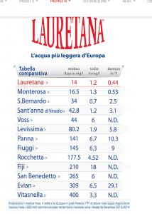 La pubblicità sottolinea che Lauretana contiene solo 14 m/litro di sali minerali e 1,2 mg/ litro di sodio (praticamente inesistente) ma questo non è certo un elemento interessante. Secondo quanto riportato in diversi testi l’acqua di tutti i giorni può avere un contenuto in sali minerali variabile da 50 a 500 mg/litro, per cui la presenza di così pochi sali minerali non necessariamente deve essere considerato un indice di qualità.