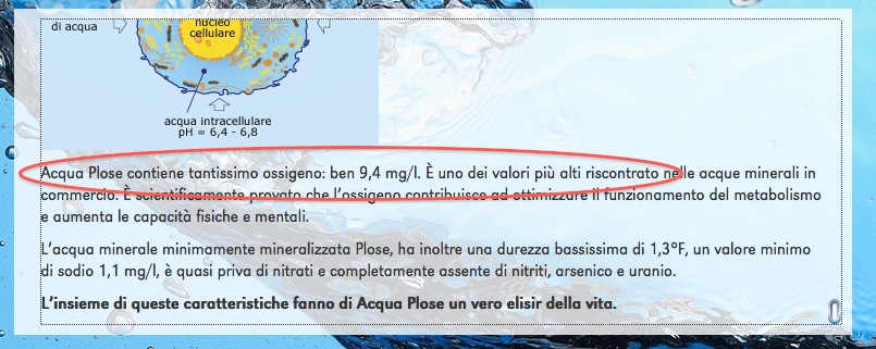 «Ossigenatevi! Acqua Plose. La Minerale con 9,4 mg/l di ossigeno» questa frase della pubblicità lascia intendere, in contrapposizione con l’art. 2 del Codice di Autodisciplina della Comunicazione Commerciale che bevendo l’acqua si abbia un beneficio psicofisico dovuto alla quantità di ossigeno. Il claim scelto per reclamizzare l’acqua Plose è infatti privo di validità scientifica.