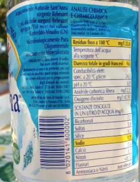 L’etichetta dell’acqua minerale Sant’Anna risulta difettosa da questo punto di vista, poiché la quantità (1,5 litri) è indicata su uno dei quattro lati dove però non è presente la denominazione di vendita e quindi non figurano nello stesso campo visivo come dice la norma. In compenso su questo lato troviamo l’immagine e la descrizione del tè Sant’Anna che è una bevanda diversa dall’acqua minerale contenuta nella bottiglia.