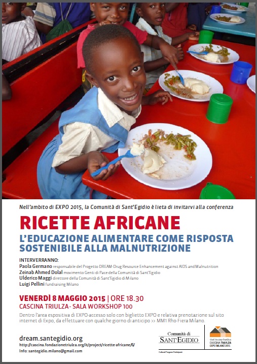 L’8 maggio, all’interno dell’area espositiva Expo, presso la Cascina Triulza – sala workshop 100, si parletà di Centri nutrizionali per i bambini in Africa, con Paola Germano, coordinatrice internazionale del programma DREAM Questo progetto – al di là della nutrizione – ha l’obiettivo di far nascere bambini sani da madri sieropositive (a oggi è riuscito nell’intento con circa 30 mila bambini). Ovviamente, l’alimentazione occupa una parte progetto proprio perché permette alle donne ai loro figli di vivere sani.