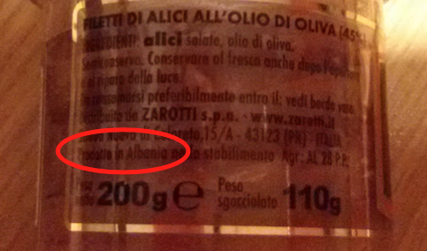 Ho comprato da Esselunga un vasetto di alici pubblicizzate come “Alici di Cetara” della ditta Zarotti. Peccato però che siano prodotte in Albania e non a Cetara, il noto comune di Salerno! Massima delusione.