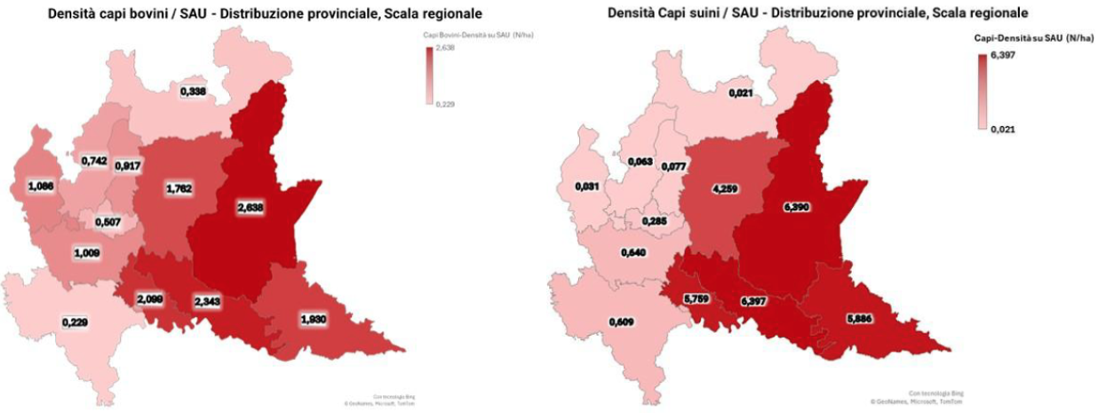 Lo studio ha analizzato l’impatto ambientale, sociale ed economico degli allevamenti lombardi. Nella regione si concentra circa il 10% degli allevamenti italiani, che ospitano al loro interno oltre 5,2 milioni di bovini e suini, pari al 40% del totale nazionale, dato che sale al 47% per i soli suini. Considerando che in Lombardia vivono 10 milioni di persone, stiamo parlando di più di un capo ogni due abitanti. Inoltre, si registra una forte concentrazione territoriale nelle province di Mantova, Cremona e Brescia: quest’ultima è la prima provincia italiana per numero di bovini e suini allevati.