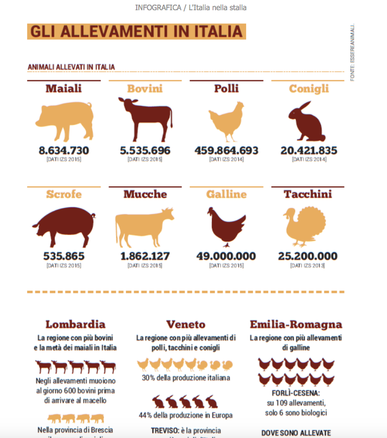 In Italia? Come si evince dall’infografica, polli e conigli sono gli animali più diffusi nel 2015 seguiti da suini e bovini in ultima posizione. A livello regionale, la Lombardia è la regione con più mucche e con la metà dei maiali di tutto lo stivale. Il Veneto, invece, alleva più polli, conigli e tacchini.