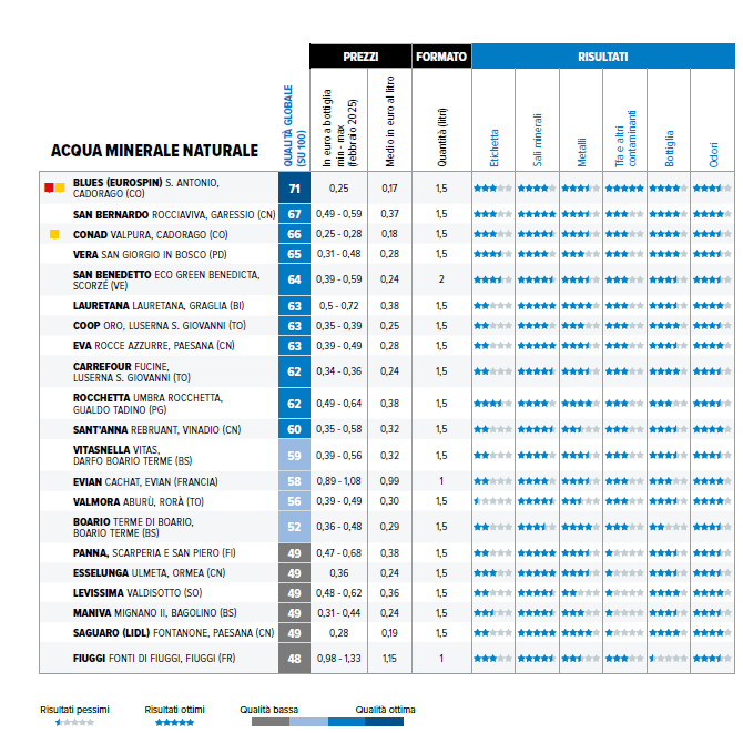 Per quanto riguarda gli altri risultati del test, prevedibilmente l’acqua minerale Blues Eurospin Sant’Antonio si è aggiudicata il titolo di ‘Migliore del test’ per gli ottimi risultati in quasi tutti dei parametri analizzati, ma anche quello di ‘Migliore acquisto’ per la convenienza, che condivide con Conad Valpura (terza posizione). Tra le due si piazza San Bernardo Rocciaviva, che ha ricevuto un’ottima valutazione nelle analisi chimico-fisiche. Seguono poi l’acqua minerale Vera, la già citata San Benedetto Eco Green, Lauretana, Coop Oro, Eva Rocce Azzurre, Carrefour Fucine, Rocchetta e Sant’Anna Rebruant: tutti questi prodotti hanno ricevuto un giudizio globale buono.
