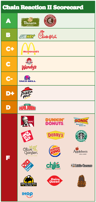 Il rapporto, intitolato Chain Reaction II, vede in testa alla classifica Panera e Chipotle, che sono le uniche due compagnie che servono per la maggior parte carne di ogni tipo non trattata con antibiotici. Agli ultimi posti, invece, ci sono noti marchi come KFC, Burger King e Starbucks.