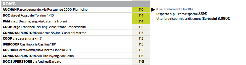 A Roma, il podio spetta all’Auchan di Parco Leonardo (Fiumicino), seguito, con un bel distacco da Doc di via del Fosso del Torrino a parimerito con il Pam di via di Decima. In terza posizione con un punteggio di 115 seguono ben 5 punti vendita tra Coop, Conad, Ipercoop e Auchan. In fondo alla classifica romana (qui non rappresentata) troviamo il PIM di via Torrevecchia, Emme Più di Via Cassia e il Pam di Via Gianfilippo.