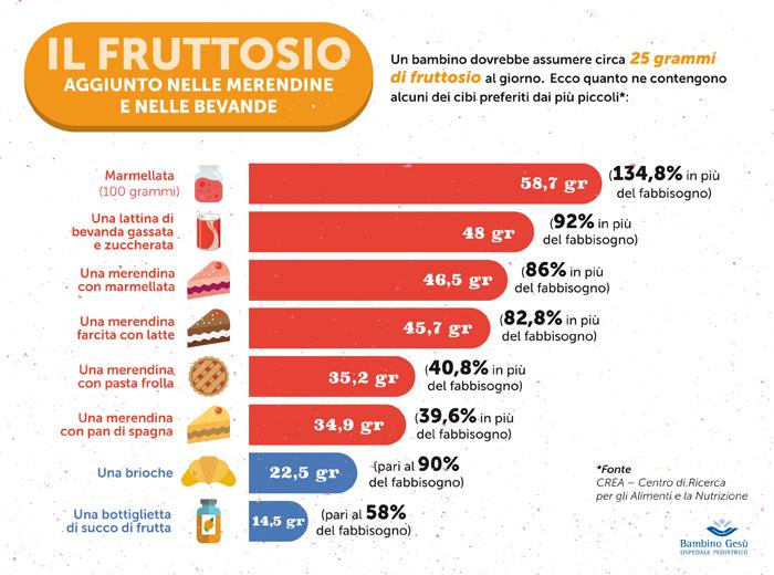 Non esiste un fabbisogno minimo di fruttosio nella dieta ma, al contrario un limite massimo di zuccheri semplici da non eccedere e ampiamente superato dai nostri bambini.