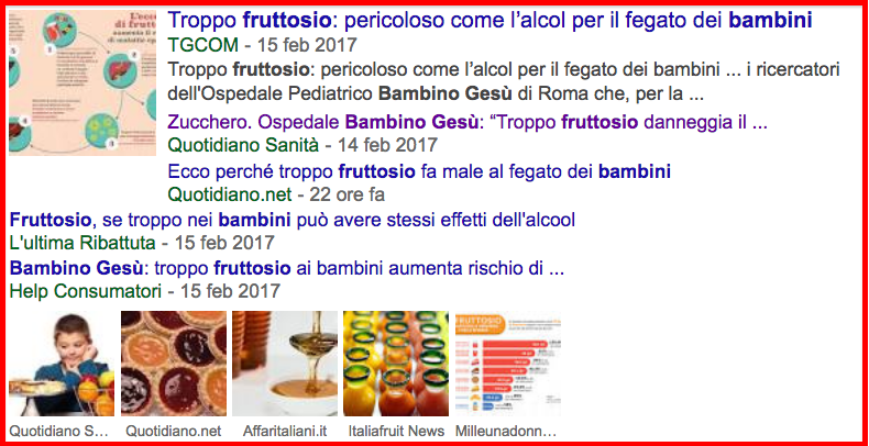 Purtroppo questi dati sono ripresi da 30 testate online tra cui TgCom24, La Stampa e altri siti scientifici come Leonardo. Anche sulla carta stampata Il Messaggero e L’Avvenire pubblicano la notizia con un certo risalto. Nessuno si accorge degli errori talmente grossolani da fare sobbalzare sulla sedia un neolaureato in materie scientifiche. Nel testo del Bambin Gesù si dice che “Il nemico dei bambini è il fruttosio aggiunto presente negli sciroppi e nei dolcificanti largamente utilizzati dall’industria nelle varie preparazioni alimentari (marmellate, bevande, merendine, succhi di frutta, caramelle). Basti pensare che una sola lattina di bevanda zuccherata contiene il doppio della quantità giornaliera di fruttosio indicata per l’età pediatrica (circa 25 grammi). Un barattolo di marmellata confezionata ha una concentrazione di fruttosio 8 volte maggiore del fabbisogno quotidiano; una merendina …. una bottiglietta di succo di frutta …”.