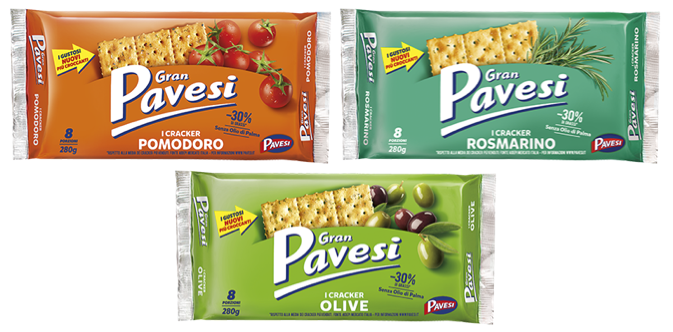 Eccoli, sono arrivati i nuovi cracker Gran Pavesi al pomodoro, alle olive e al rosmarino tutti col il 30% di grassi in meno. Lo dice la pubblicità e lo ribadisce la frase sul frontespizio della confezione “-30% di grassi – senza olio di palma”. Il calcolo è stato fatto considerando il contenuto di grassi presente nei cracker più venduti (dal 9,6 al 15%). È vero, le nuove proposte Gran Pavesi hanno solo il 9% di lipidi, ma confrontando il profilo nutrizionale di questi cracker con il sistema a semaforo francese Nutri-Score (*), con quello dei Craker classici salati Gran Pavesi (senza granella di sale in superficie), il giudizio risulta peggiore (vedi figura sotto).