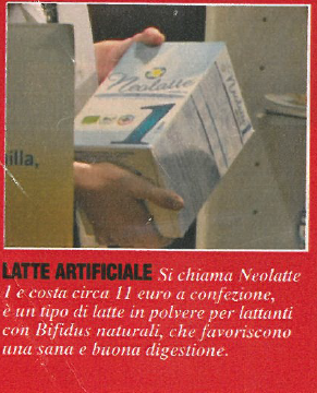 Oltre ad essere una pubblicità occulta viola pesantemente il Codice Internazionale sulla Commercializzazione dei sostituti del latte materno (www.ibfanitalia.org). In Italia la legge è meno restrittiva rispetto al codice stesso, ma è comunque vietato fare QUALSIASI pubblicità al latte in formula di tipo 1 (come quello della foto). Quindi c’è pure un altro reato da considerare.