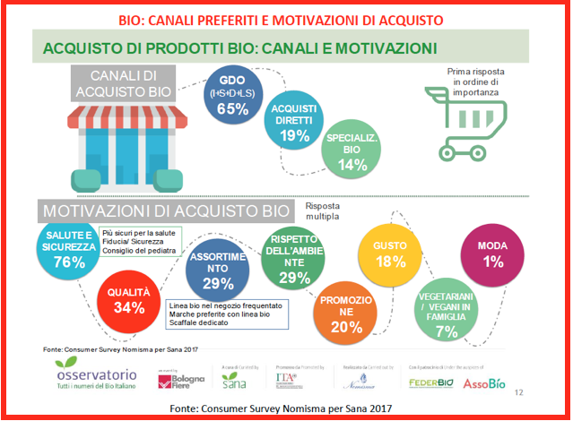 I principali canali di acquisto sono supermercati e ipermercati e da un paio d’anni anche i discount offrono prodotti biologici, con buoni risultati. Questi prodotti in effetti sono sempre più presenti nella grande distribuzione, sempre più visibili e alcuni generi, come le gallette di riso, si trovano più facilmente a marchio bio piuttosto che convenzionali. Per quanto riguarda le motivazioni, chi acquista biologico dichiara di farlo principalmente per aspetti relativi a salute e sicurezza (76% degli acquirenti), seguono qualità (34%), assortimento (29%) e rispetto per l’ambiente (29%).