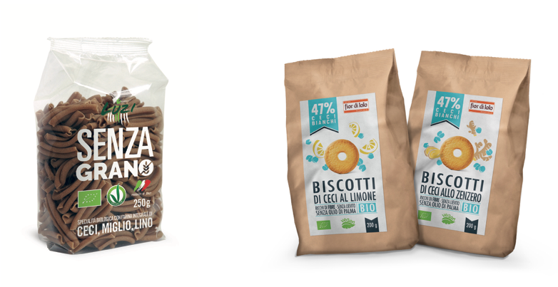 Per soddisfare le esigenze degli intolleranti al glutine e di chi preferisce proteine di origine vegetale, le farine di legumi sono impiegate in modi sempre più fantasiosi, anche per la pasta. Al sana abbiamo visto gli strozzapreti Senza grano di Luzi, a base di ceci, miglio e lino, e le penne di farina di piselli a marchio Dalla Costa. Ma non mancano neppure i biscotti di farina di ceci.