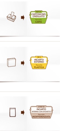 Nel primo caso (sulla sinistra nella foto) le parole sul disegno colorato di verde dicono: INCARTO RACCOLTA CARTA, e questa frase non lascia spazio a dubbi sul destino della confezione.
