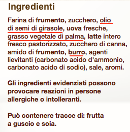 La nostra lettrice fa notare che sulla stessa pagina, nella lista degli ingredienti (vedi foto 2) dopo la farina di frumento e lo zucchero compare l’olio di semi di girasole e il grasso vegetale di palma. In fondo alla lista c’è il burro, ma si tratta di una quantità ridicola (1,8%), un valore da 8 a 10 volte inferiore rispetto agli altri grassi. Non bisogna avere studiato storia della gastronomia per sapere che l’olio di girasole e il grasso di palma sono ingredienti estranei alla “tradizionale pastafrolla”.