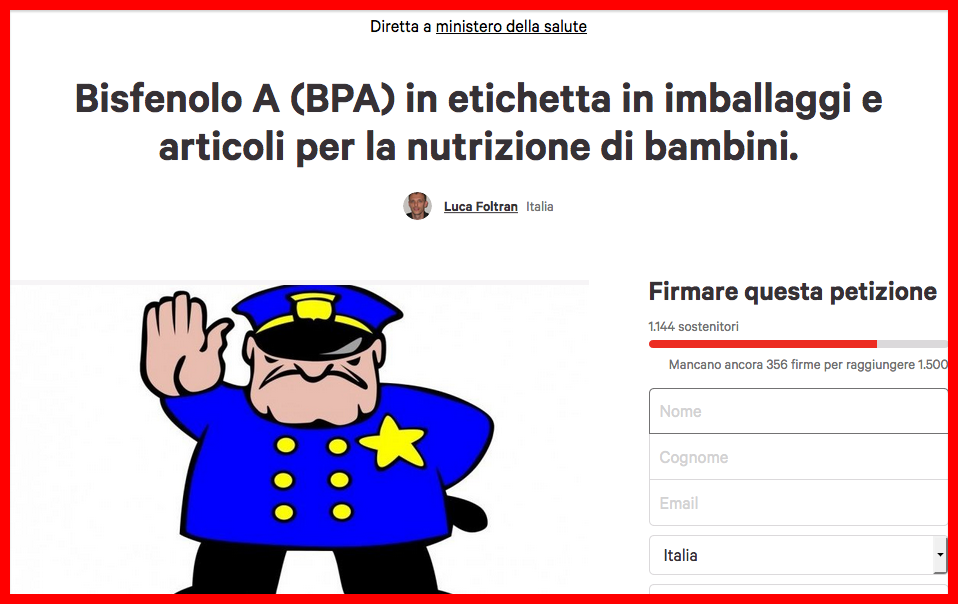 Firma la petizione: Bisfenolo A (BPA) in etichetta in imballaggi e articoli per la nutrizione di bambini.