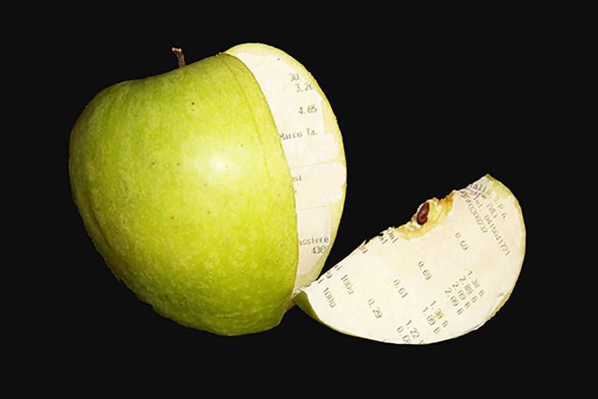 Silvia Moscati, autrice dell’articolo, ha realizzato con gli scontrini alcune opere. Oneri indeducibili è la prima collezione del 2013, composta da un abito scamiciato, con giacca e acconciatura interamente fatti di scontrini fiscali cuciti a mano su base di stoffa. Un altra collezione Exfood 2015 è composta con pasta, pane, liquidità… L’ultima opera Arrivederci e grazie, prende il titolo dalla frase finale impressa sullo scontrino fiscale.