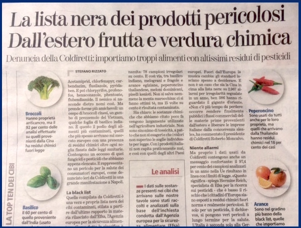 Si tratta dell’ennesima iniziativa di Coldiretti che cerca di screditare a tutti i costi i prodotti alimentari importati, creando una sorta di terrorismo alimentare ingiustificato visto che su 81 mila campioni analizzati (vale la pena ripeterlo) “i limiti di legge per quanto attiene i residui di antiparassitari sono superati dall’1,4% dei campioni UE/SEE e dal 5,7% dei campioni dei paesi extra UE”. Coldiretti farebbe bene a focalizzare l’attenzione non tanto sui broccoli cinesi che nessuno ha mai visto ma sullo scandalo del latte con le aflatossine cancerogene, venduto dagli allevatori ai caseifici che ha coinvolto in questi ultimi giorni decine di aziende agricole in Lombardia, Veneto ed Emilia – Romagna, penalizzando l’immagine di formaggi Dop come il Grana Padano.