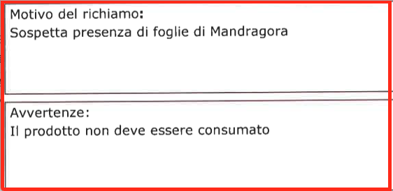 L’allerta del Ministero della salute è rientrato. La revisione di analisi effettuata dall’Agenzia di Tutela della Salute della Città Metropolitana di Milano conferma che non c’è presenza di sostanze anticolinergiche all’interno del prodotto (ovvero di mandragora, l’erba infestante velenosa, la cui presenza era stata ipotizzata inizialmente). I sospetti iniziali si sono rivelati errati. Per cui il prodotto può essere consumato. Adesso le ricerche sono orientate verso l’acquisto di altra verdure comprata presso un mercato locale di Milano