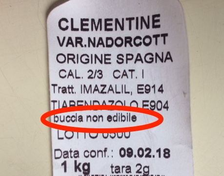 Imazalil – fungicida spruzzato sulla superficie degli agrumi per prolungare la conservazione. Quando viene usato è obbligatorio scrivere sull’etichetta anche la dicitura “Buccia non edibile”