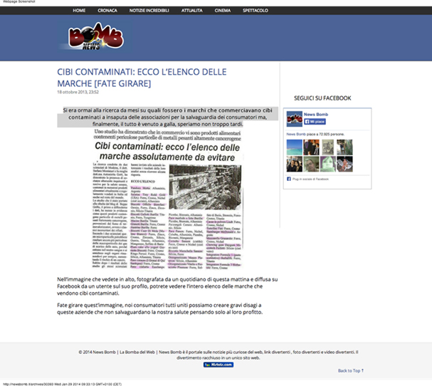 Continuano le segnalazioni di bufale su Facebook dove abbiamo ritrovato, per l’ennesima volta, la notizia dei cibi contaminati da nanoparticelle. In rete gira questo finto articolo di giornale che ha creato qualche allarme anche tra i nostri lettori. Il Fatto Alimentare si è già occupato di questa storia. Si tratta di una bufala, di uno scherzo di cattivo gusto realizzato con una certa furbizia. L’articolo cita uno studio condotto da scienziati modenesi in collaborazione con Beppe Grillo, dal quale emergerebbe la presenza di microparticelle di metalli pesanti in una serie di prodotti alimentari e si individua l’origine del problema nelle emissioni dei termovalorizzatori.