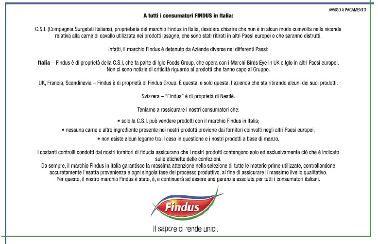 In Italia, per ora, non sembra siano state trovate partite contraffatte. Proprio oggi la società che detiene il marchio Findus in Italia, la Compagnia Surgelati Italiani, ha comprato alcuni spazi pubblicitari sui quotidiani ( vedi foto a sinistra) per spiegare di non essere in alcun modo coinvolta, di non vendere alcun prodotto confezionato con le carni provenienti dai fornitori coinvolti e di essere l’unica azienda autorizzata a commercializzare Findus, potendo quindi garantire la qualità e l’aderenza rispetto a quanto indicato in etichetta.