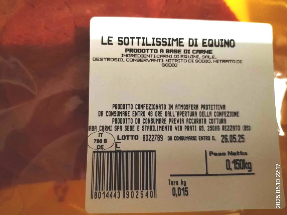 Buonasera, oggi ho comprato una confezione di fettine sottili di cavallo nel banco della carne ( vedi foto). Arrivata a casa, mentre le mettevo in frigo mi sono accorta che tra gli ingredienti sono indicati dei conservanti. La cosa mi ha lasciata abbastanza sorpresa e delusa. Adesso anche nella carne (che dovrebbe essere fresca) mettono i conservanti? Silvia