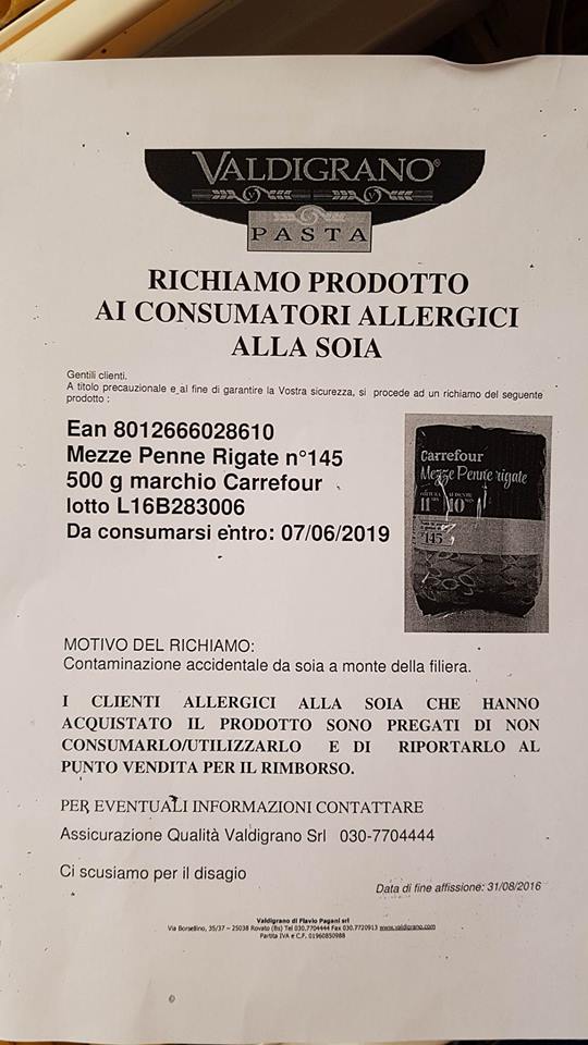 La catena di supermercati Carrefour ha diffuso l’avviso (vedi sotto) del ritiro di un formato di pasta per la presenza non dichiarata in etichetta di tracce si soia. Si tratta delle Mezze Penne Rigate n°145 a marchio Carrefour, prodotte dal pastificio Valdigrano che ha provveduto al ritiro. Le confezioni richiamate sono quelle con numero di lotto L16B283006, in confezione da 500 grammi e termine minimo di conservazione 07/06/2019, codice EAN 8012666028610.