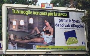 Il messaggio pubblicitario “Tua moglie non sarà più la stessa perché la Spesa da noi vale Doppio”, diffuso poche settimane fa attraverso cartelloni affissi nella città di Palermo è stato censurato dal Comitato di controllo dello Iap in palese violazione all’art. 10 (*) (Convinzioni morali, civili, religiose e dignità della persona del Codice di Autodisciplina della Comunicazione Commerciale.
