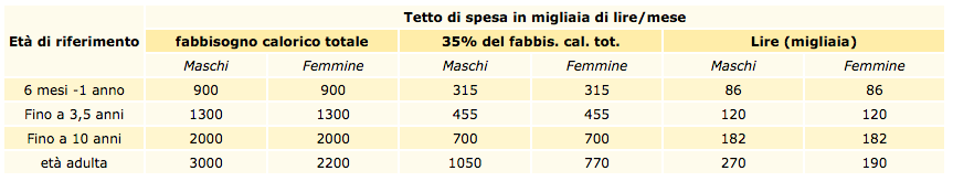 La tabella indica, per sesso e per fascia di età, il fabbisogno calorico totale e la quota, pari al 35%, da soddisfare con i prodotti senza glutine per i soggetti affetti da morbo celiaco. La tabella riporta i corrispondenti tetti di spesa mensili a carico del Servizio sanitario nazionale, calcolati sulla base dei prezzi medi dei prodotti ed incrementati di una percentuale pari al 30% per tener conto di particolari esigenze nutrizionali.” (art. 3.Morbo celiaco, compresa la variante clinica della dermatite erpetiforme)