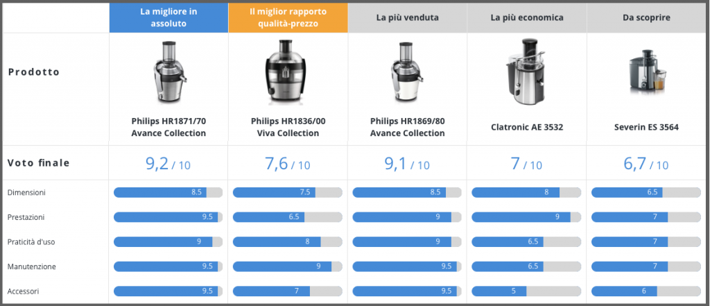 Nel test sono stati messi a confronto 13 modelli, di cui 7 Philips, 2 Severin, e poi una Clatronic, una Russell Hobbs, una Duronic e una Bosch. Nella classifica finale, troviamo però solo cinque modelli che hanno ricevuto i punteggi più alti, di cui tre della Philips. Il migliore in assoluto è Philips HR1871/70 Avance Collection, in quanto soddisfa pienamente tutti i parametri, anche se il prezzo è impegnativo, più di 150 euro. Al secondo posto del test troviamo il prodotto più venduto: Philips HR1869/80 Avance Collection, che con una spesa sugli 80 euro garantisce ottime prestazioni.
