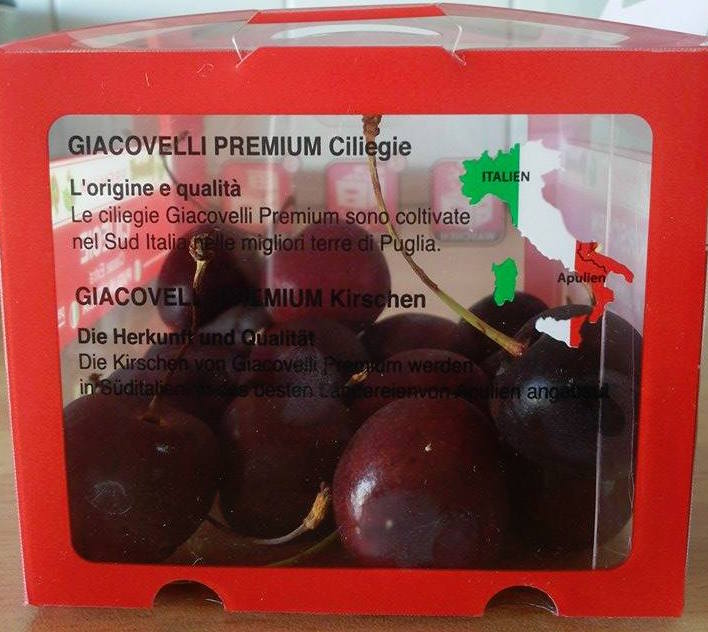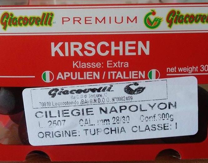 Abbiamo ricevuto quasi contemporaneamente le segnalazioni di due lettrici che si lamentavano di un’etichettatura alquanto ambigua sull’origine delle ciliegie che avevano acquistato. In entrambi i casi si tratta di duroni varietà Napolyon confezionati dalla ditta Giacovelli srl di Bari.