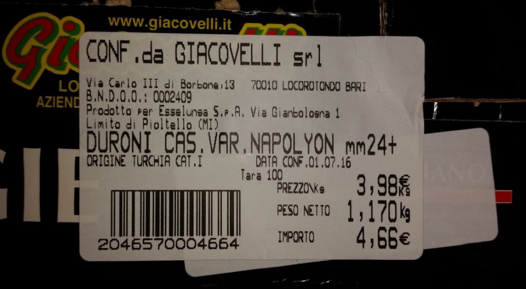 Sul cartello in negozio, posto in corrispondenza del prodotto, e sul cartoncino è indicata chiaramente l’origine Turchia. L’imballaggio prodotto in Puglia, e utilizzato per i duroni italiani, è stato usato anche per i duroni turchi ma debitamente coperto con etichette adesive. Esselunga è in ogni caso disposta a esibire i documenti legali attestanti l’origine turca del prodotto.