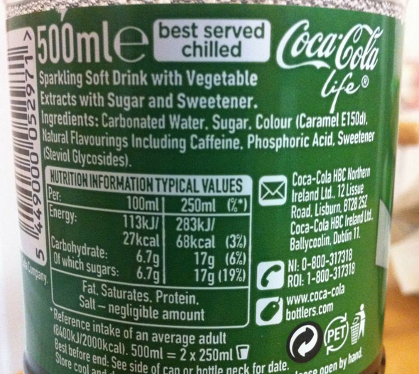 Coca-Cola life, la nuova bibita verde della multinazionale americana è arrivata anche in Italia. Si trova già nei supermercati Esselunga dove viene venduta ad un prezzo pressoché identico a quella classica. La nuova bibita caratterizzata dal colore verde contiene meno zucchero, grazie all’apporto dell’edulcorante estratto delle foglie di stevia. La bibita, lanciata nel 2013 in Argentina e in Cile e poi diffuso anche negli Stati Uniti e in diversi Paesi europei (Gran Bretagna, Svezia, Irlanda, Belgio, Francia, Lussemburgo, Olanda e Svizzera), ha un contenuto energetico pari al 60% rispetto alla versione classica. In altre parole se un litro di bibita classica contiene 420 kcal o se preferite 21 cucchiaini di zucchero, l’omologa bevanda verde arriva a 270 kcal pari a più di 13 cucchiaini. Gli ingredienti sull’etichetta sono: acqua, zucchero, anidride carbonica, colorante E 150d, aromi naturali (inclusa caffeina), acidificante acido fosforico, edulcorante glicosidi steviolici. L’obiettivo è collocare la nuova lattina verde a metà strada tra la bibita tradizionale e la Coca-Cola Zero che utilizza dolcificanti di sintesi e una lattina contiene poco più di 0,6 kcal. L’auspicio dell’azienda è di soddisfare le esigenze di chi critica l’elevato apporto di zuccheri e l’utilizzo di dolcificanti di sintesi.