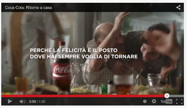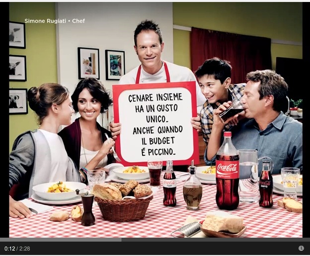 Gli spot in onda sulle reti tv e online mostrano la gioia di cenare o pranzare in famiglia grazie alla presenza di Coca-Cola posizionata bene in vista sulla tavola imbandita. Si parte dallo spot del 2011 che racconta la formula della felicità in tavola, dicendo che “le mamme hanno allietato i pasti delle famiglie con la Coca-Cola” (veicolando tra l’altro un messaggio ambiguo sulla concezione di famiglia e figura femminile). Nel 2012 il cuoco Simone Rugiati si presta a cucinare in una piazza di Napoli, dove sembra che la bontà e la bellezza della cena siano date dalla presenza della bibita zuccherata. Lo spot faceva parte di una serie intitolata “Ceniamo insieme?”, che l’Istituto di autodisciplina pubblicitaria ha chiesto di ripensare in un’altra chiave, proprio perché sbagliato in quanto “proporre modelli di consumo e stili di vita non improntati alla massima correttezza, in termini di educazione alimentare”.