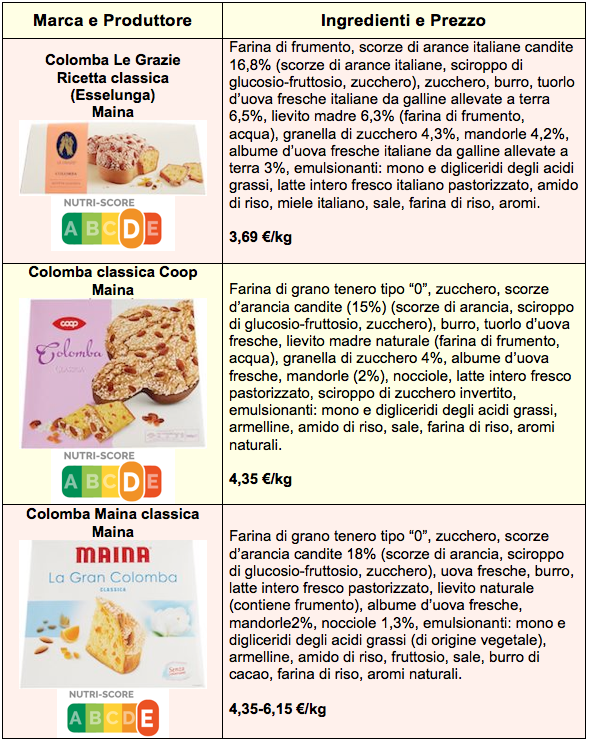 Se un dolce si chiama colomba segue il disciplinare, quindi quelle industriali sono piuttosto simili fra loro, però dall’etichetta possiamo verificare la correttezza della ricetta e quali additivi sono presenti. Per quanto riguarda il gusto, è necessaria una prova d’assaggio. I prezzi evidenziati in tabella sono stati rilevati nel periodo 10-13 marzo 2018.