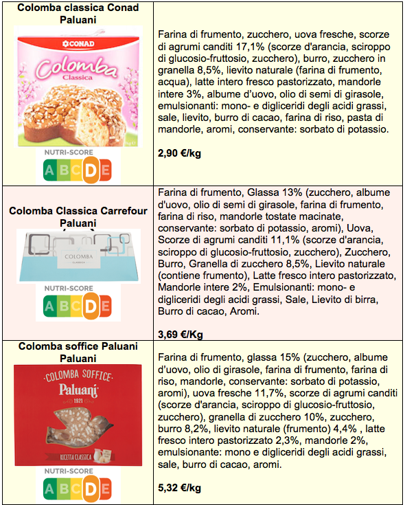 I primi ingredienti sono sempre farina, zucchero e scorze d’arancia candite, seguiti da burro, uova e lievito naturale. In coda i componenti della glassa (albume, mandorle, granella di zucchero), gli aromi e gli emulsionanti, utilizzati per mantenere a lungo la morbidezza. La ricetta della colomba Carrefour sembra diversa perché gli ingredienti della glassa sono raggruppati in seconda posizione. Solo le colombe Conad e Paluani (preparate nello stesso stabilimento) contengono il conservante sorbato di potassio, mentre il dolce S-Budget (venduta da Despar) utilizza anidride solforosa come conservante delle scorze candite.