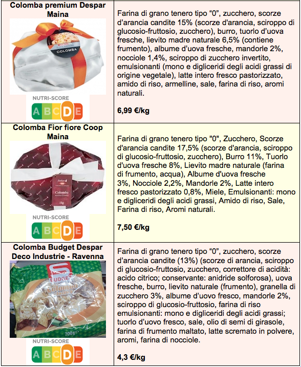 È importante in tutti i casi fare riferimento al prezzo al chilo, perché a volte la colomba con il listino più basso ha una confezione simile alle altre ma pesa di meno. La colomba S-Budget, linea “primo prezzo” Despar, è proposta in una confezione dall’aria povera, priva di astuccio di cartoncino all’invitante prezzo di 2,99, però pesa solo 700 g (4,3 €/kg), in linea con le altre private label. Infine una curiosità: a Ferrara si trovano anche le colombe dedicate alla Spal, squadra di calcio locale che lo scorso anno è stata promossa in serie A, da cui mancava da 50 anni. Le produce l’azienda Dal Colle (Verona) e costano 8 €/kg.
