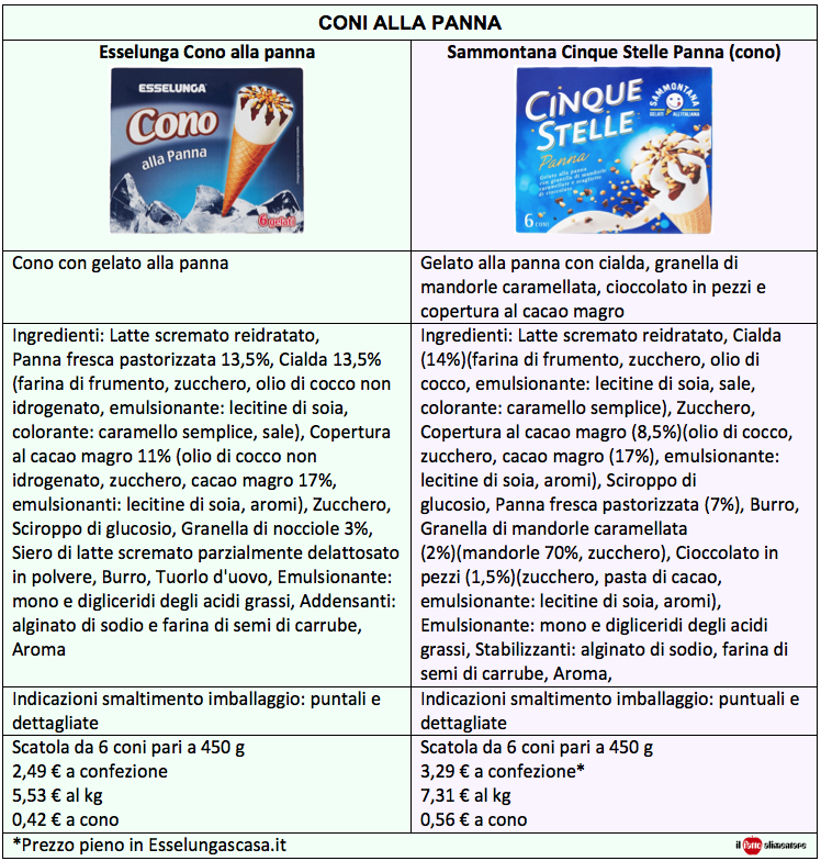 Gli altri ingredienti sono: zucchero, sciroppo di glucosio e burro, nonché emulsionanti, addensanti e aromi. Per quanto riguarda il prezzo una confezione di sei coni Sammontana costa 80 centesimi in più rispetto a Esselunga (valori rilevati sul sito nel supermercato virtuale esselungaacasa.it). Si tratta di pochi centesimi che influenzano poco sulla scelta di acquisto (un cono Sammontana costa 0,56 € contro i 0,42 € di Esselunga). Per questo tipo di gelato possiamo dire che il rapporto qualità/prezzo premia Esselunga, forse il cono più “ricco” sul mercato sia per la quantità di panna sia per la copertura al cacao e granella proposto e un prezzo davvero competitivo (vedi tabella sotto).
