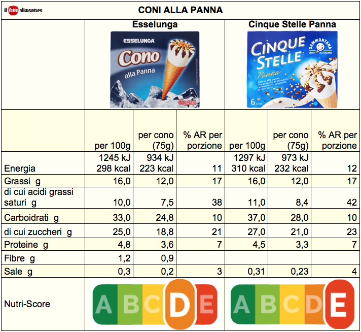 Cono alla panna: confronto fra Esselunga e Sammontana. Il produttore è lo stesso ma le ricette sono diverse. La crema di latte oltre il 13%!