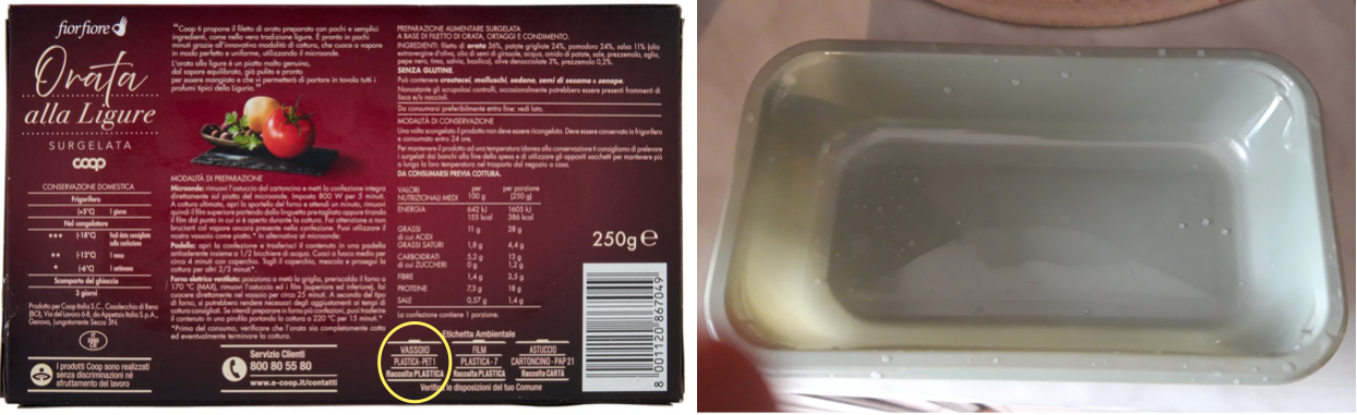 Buongiorno rilevo da una confezione di orata alla ligure surgelata Fiorfiore Coop, che il prodotto può essere cotto in forno elettrico direttamente nel vassoio. Molto pratico, se non fosse che il vassoio è di plastica, come si può rilevare sulla confezione alla voce “Etichetta Ambientale: Vassoio plastica-PET 1 Raccolta plastica.” Ovviamente il tutto è stato cucinato in un contenitore di vetro per cottura tipo Pirex, neppure in padella antiaderente! È vero che suggerisce in microonde, ma in questo caso non dovrebbe essere CPET? Che ne pensate?