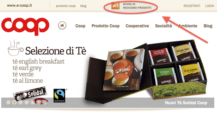 A questa lista si aggiunge oggi Coop che ha accettato il nostro invito inserendo nella home page del sito un nuovo spazio “Avviso di richiamo prodotti“, destinato a rilanciare tutte le comunicazioni riguardanti gli alimenti che vengono ritirati dal mercato in quanto possono nuocere alla salute dei consumatori. Coop precisa che è comunque prassi abituale avvisare sempre i clienti attraverso cartelli posizionati nelle corsie dei punti vendita interessati.