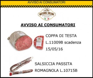 L’avviso riguarda il salume “Coppa di testa” lotto numero L.11009B con scadenza il 15/05/16, e la “Salsiccia passita” lotto numero L.10715B.