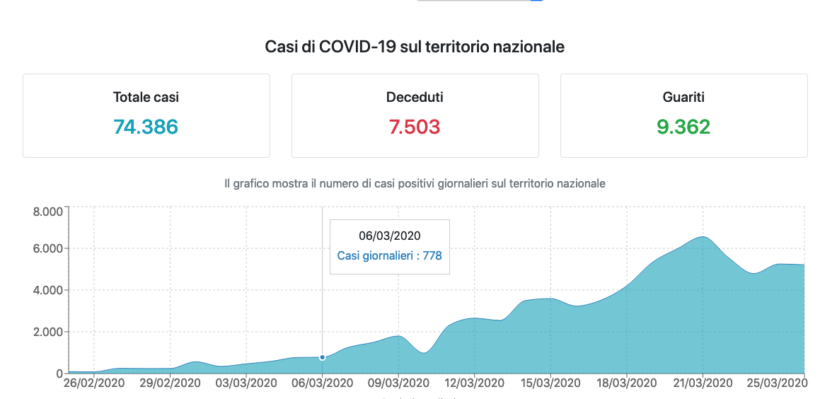 Il numero di casi attualmente positivi di contagio da coronavirus Sars-Cov-2 diminuisce per il quarto giorno consecutivo (vedi tabella sotto). Siamo passati da 4.821 a 3.491. È questo l’elemento “positivo” che si riscontra dai numeri diffusi dalla Protezione civile il 25 marzo. Il dato indica quante persone ci sono vive e positive in più rispetto al giorno prima, mentre l’aumento della quantità di persone contagiate dal virus è 3.491, ovvero la differenza tra le persone positive registrate in questa giornata, e quelle che risultano guarite o morte. Vuol dire che le misure di autoisolamento e le restrizioni di movimento e di spostamento decise dal governo due settimane fa cominciano a dare i primi frutti. Certo i numeri sono ancora molto elevati, e nella classifica mondiale siamo il seconda posizione dopo la Cina che ha avuto la metà dei morti ma molte più persone ricoverate. Le persone contagiate da coronavirus sono in totale 74.386 (5.210 in più rispetto a ieri). I morti nelle ultime 24 ore sono stati 683 (ieri erano 743). I guariti sono stati 1.036. Le persone positive sono 57.521 (3.491 in più di ieri). Aumenta anche il numero di soggetti in isolamento domiciliare sono 30.929 (ieri erano 28.697). La situazione più grave resta ancora quella della Lombardia, seguita a Emilia-Romagna e Veneto.