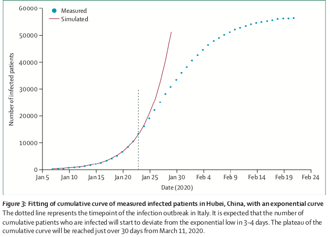 Per capire come evolverà la situazione, il report confronta i dati raccolti nella regione di Hubei in Cina (figura 3), dove la fase iniziale dell’epidemia ha avuto una progressione esponenziale. La curva di crescita ha smesso di essere esponenziale 20 giorni dopo.