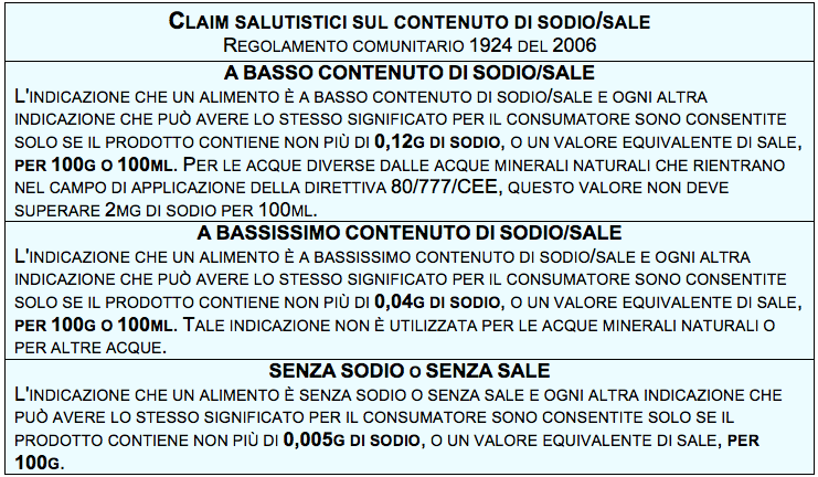 L’utilizzo di claim salutistici riferiti al contenuto di sale è normato dal regolamento comunitario 1924 del 2006 che prevede limiti precisi corrispondenti a diciture altrettanto esatte (vedi tabella sotto).