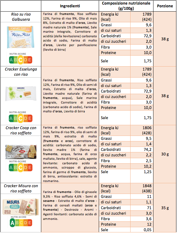Inseriti nella piattaforma francese Open Food Facts ( sistema per calcolare l’etichetta semaforo attraverso il sistema Nutri-Score (*), il Riso su riso Galbusera, Equilibrio Esselunga e Riso soffiato Coop ricevono un bollino giallo e una lettera C (tra le cinque possibili, dalla A – la migliore – alla E). Si tratta di un buon posizionamento che attesta un discreto equilibrio nutrizionale. I cracker con riso Misura meritano una A per il contenuto di sale estremamente ridotto.