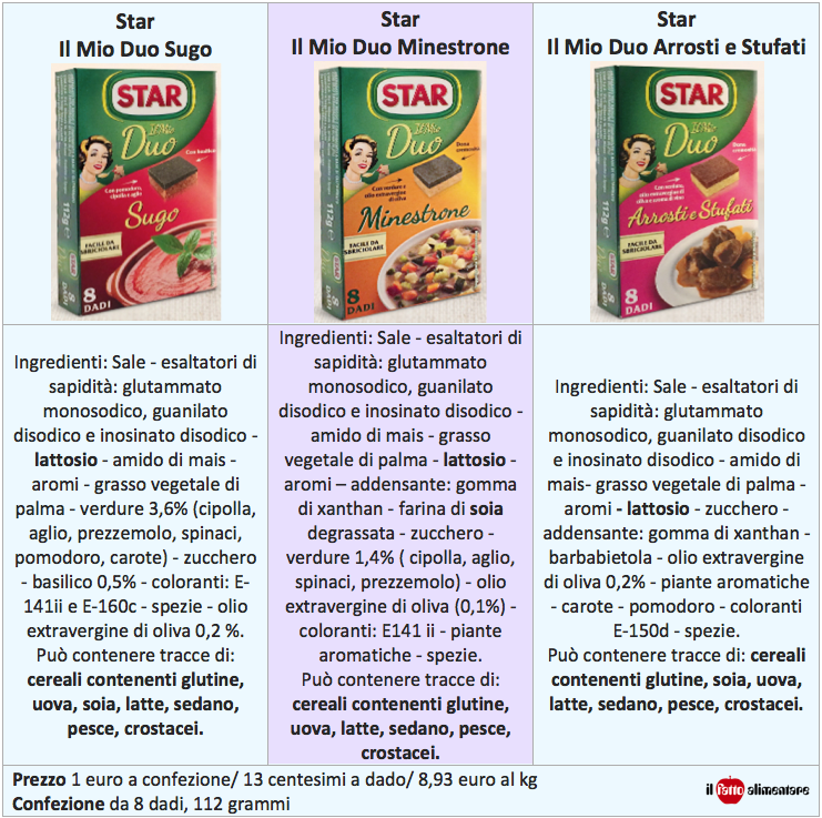 Oltre al sale e agli additivi, il nuovo preparato contiene grasso vegetale di palma, e nelle versioni Minestrone e Arrosti e Stufati anche coloranti e addensanti. L’olio extravergine indicato in etichetta rappresenta solo lo 0,1-0,2% degli ingredienti. Il nuovo dado Star ha un nuovo aspetto ma non propone ingredienti altrettanto rispetto agli insaporitori e ai preparati per brodo tradizionali. Per quanto riguarda il prezzo al momento il prodotto è stato acquistato in offerta e risulta in linea con i dadi tradizionali.